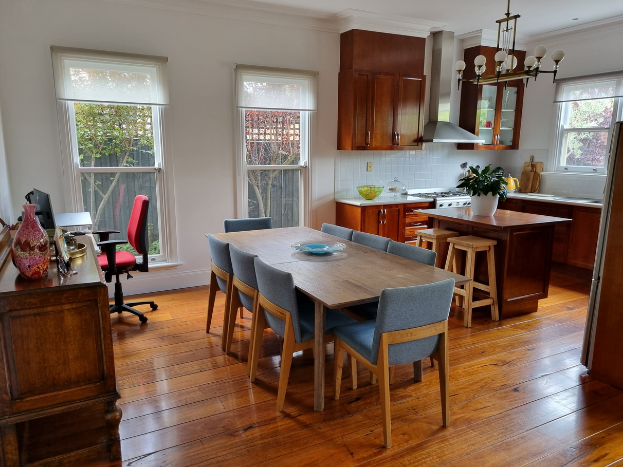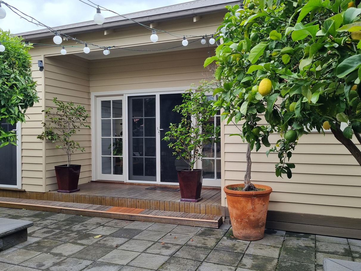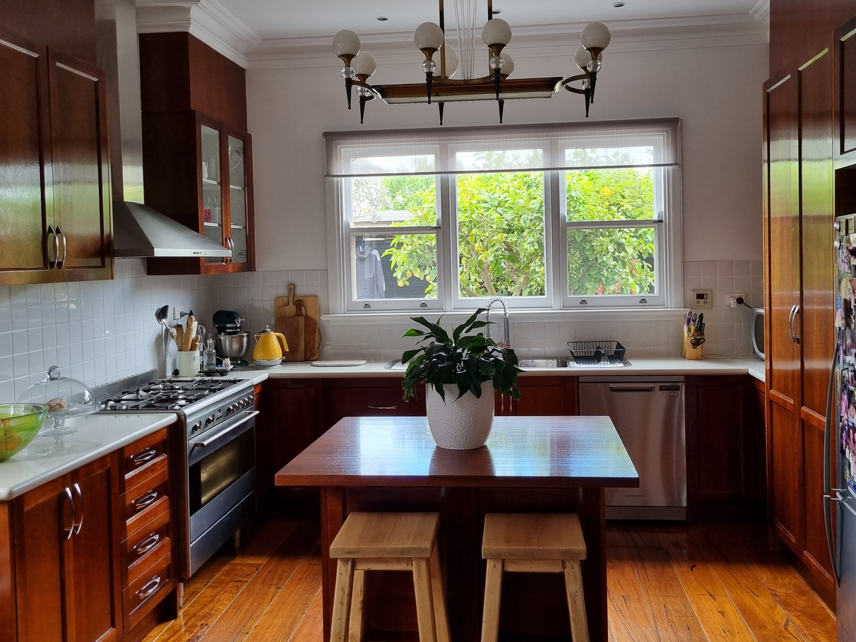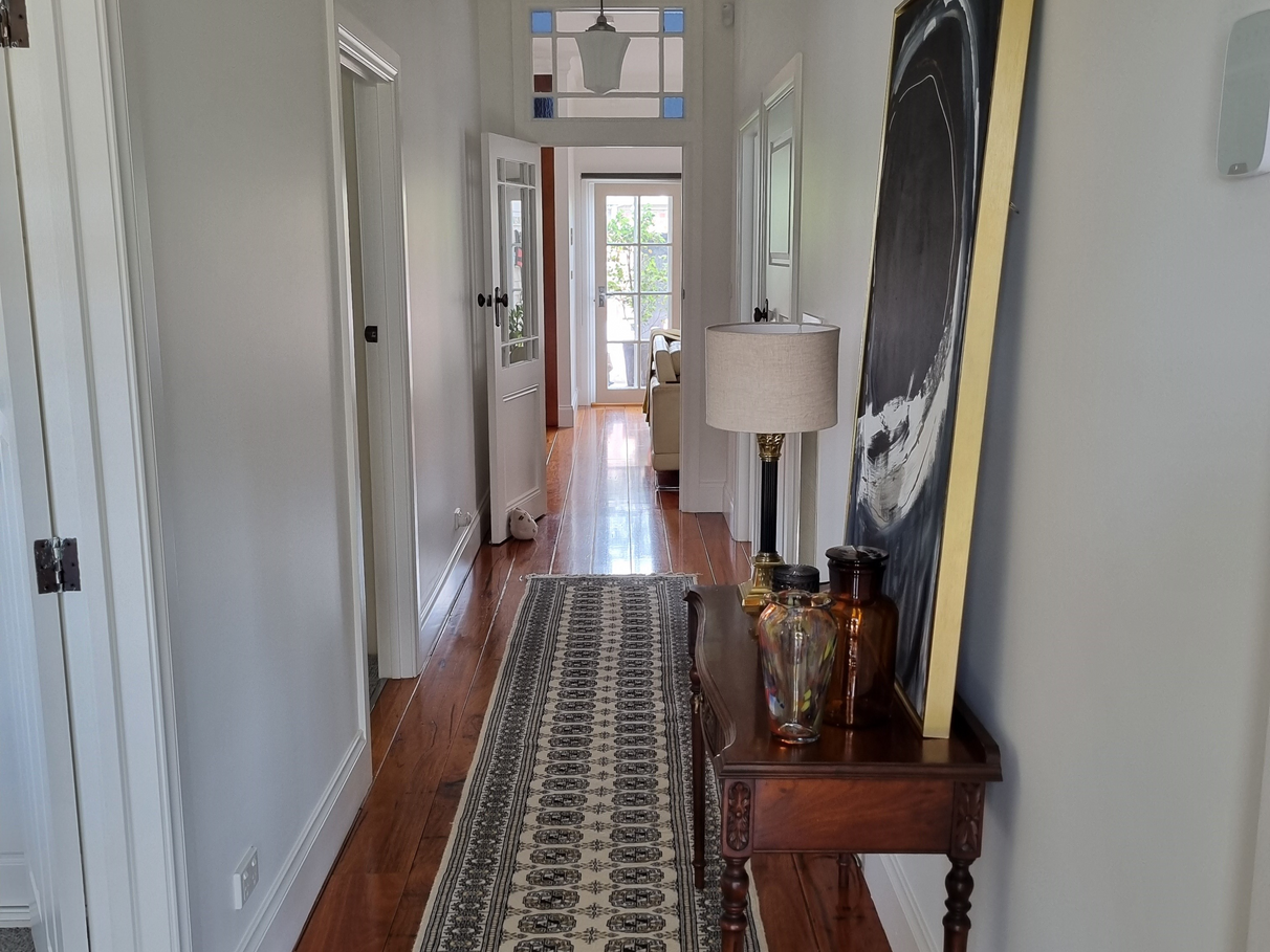 Steeped in timeless allure yet thoughtfully modernised for contemporary living, the home welcomes you with a charming hallway that features soaring ceilings, intricate decorative cornices, and the warm embrace of polished timber floorboards. Sunlight streams through double-hung windows, illuminating the original stained-glass accents that whisper stories of days gone by. The front half of the house presents generously proportioned bedrooms, each adorned with built-in wardrobes, making storage a breeze. The main bedroom is a personal sanctuary, complete with a luxurious ensuite and a spacious walk-in wardrobe, while the main bathroom exudes classic elegance.
