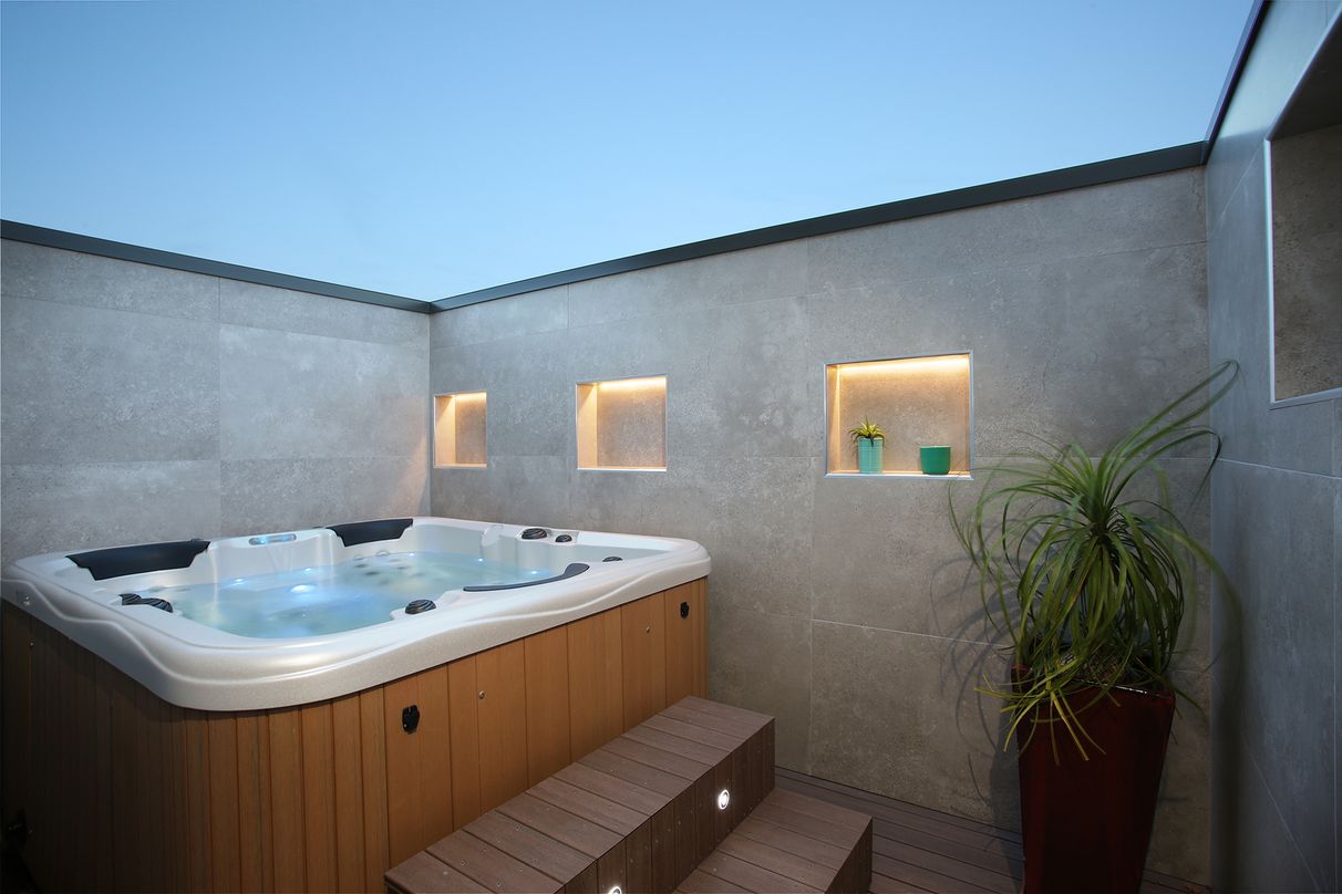 -Master suite 1 with walk-in robe, ensuite & completely private outdoor spa balcony with wall niches & mood lighting - Bliss!