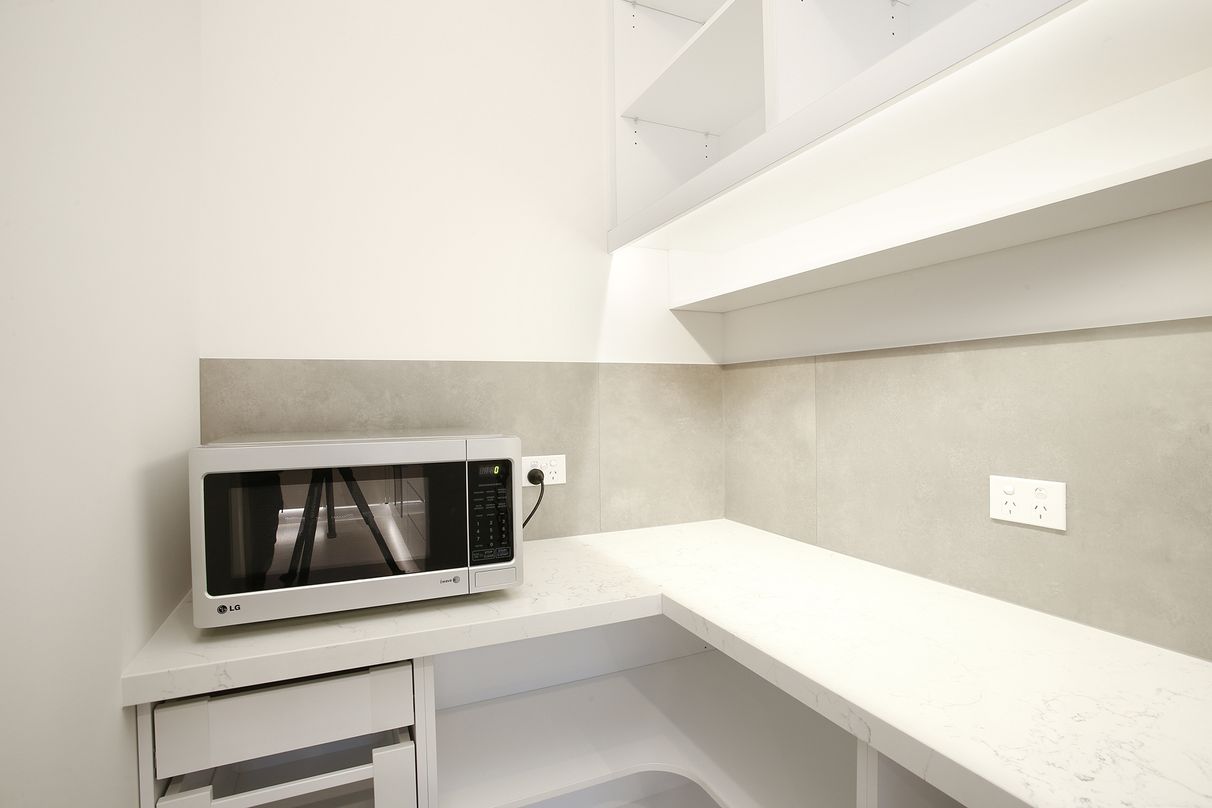 -Sleek designer kitchen: 60mm waterfall benchtops, 900mm gas cooktop & recessed range hood, concealed dishwasher, abundant streamlined storage & walk-in pantry