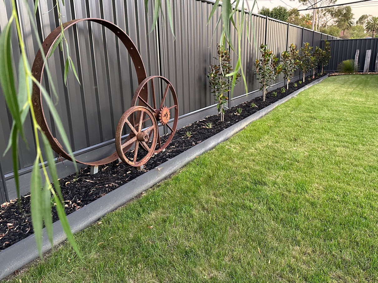 The landscaped garden requires minimal maintenance with watering system integrated throughout.