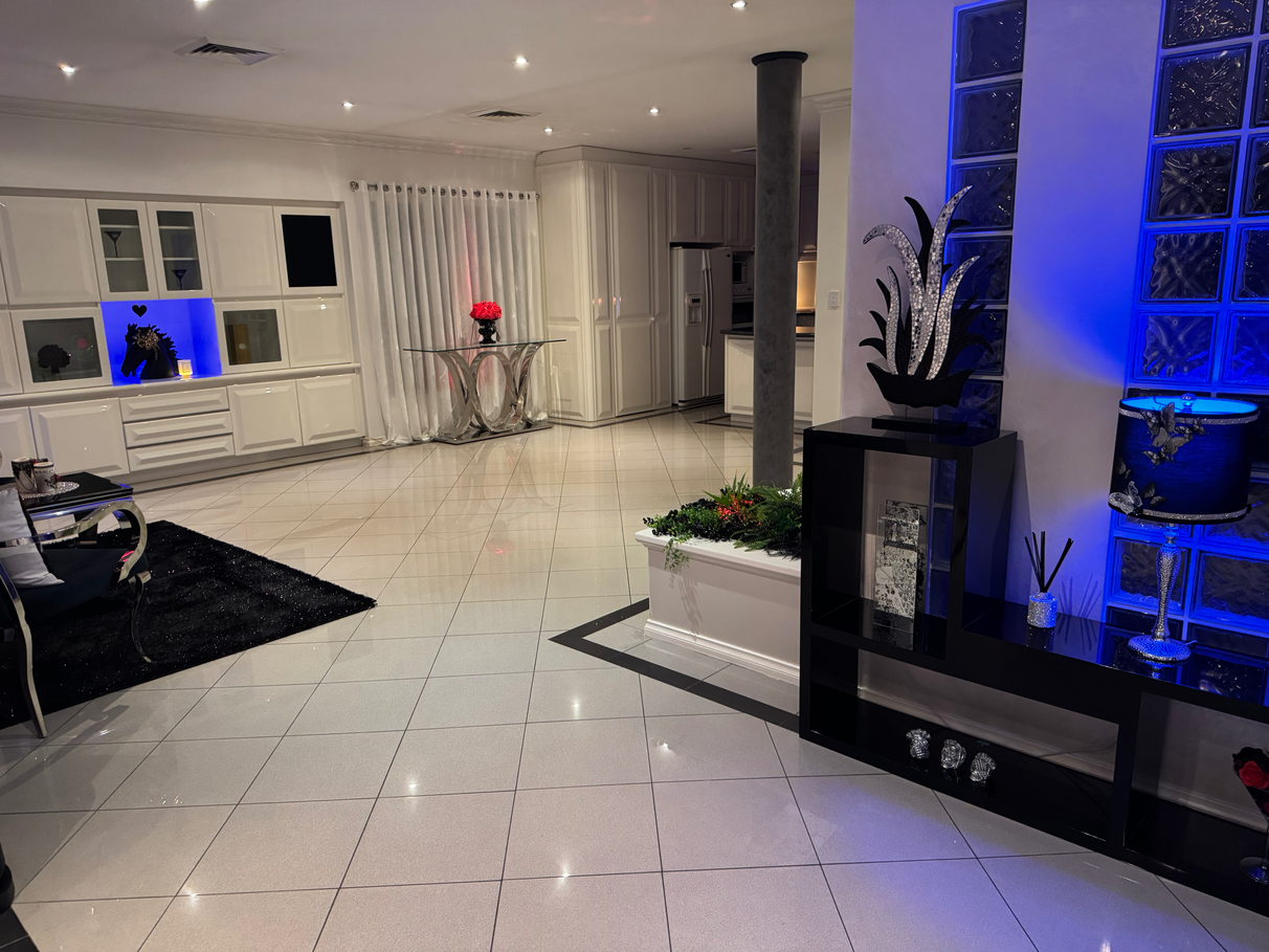 The property is fully fenced in its entirety (double brick with a graffiato finish), electronic remote control entry gates and garage door. The property also features high-tech resolution security cameras (live camera feeds to your phone as well as hidden monitors).