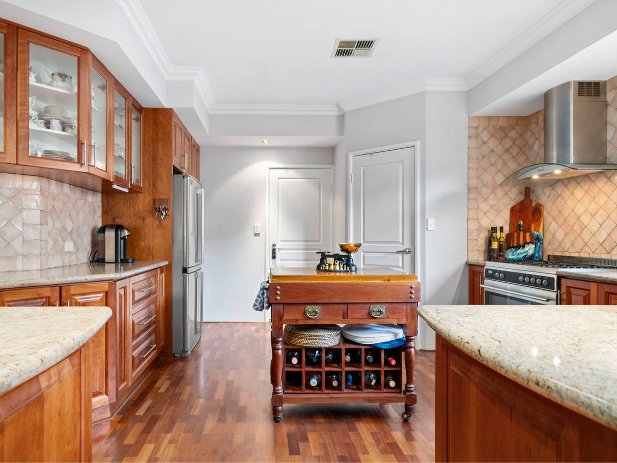 • Chef’s kitchen with walk-in pantry, stone benchtops, cabinet-to-ceiling tiles
