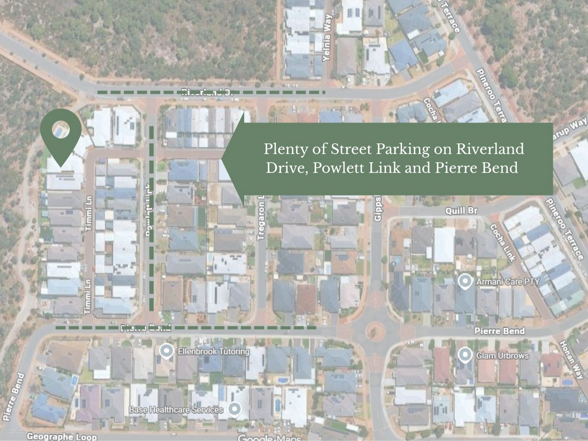 Further street parking available nearby on Riverland Drive, Powlett Link and Pierre Bend for added convenience