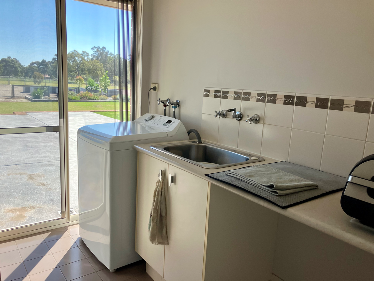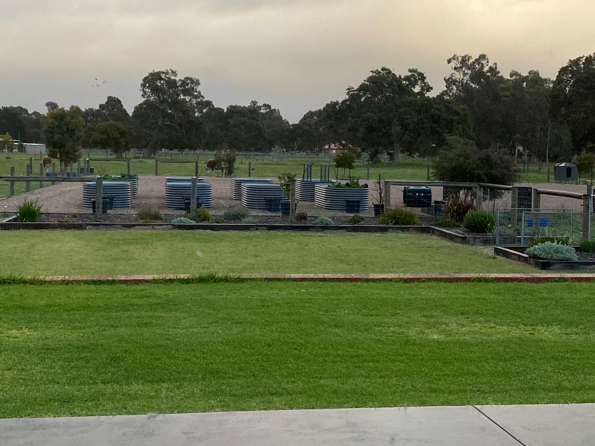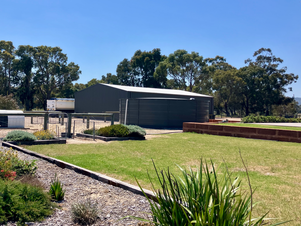 Outside, the lifestyle continues. Expansive lawns and established vegetable gardens invite outdoor living and self-sufficiency, while the bore with water licence and 140,000-litre rainwater tank ensure abundant water supply year-round.