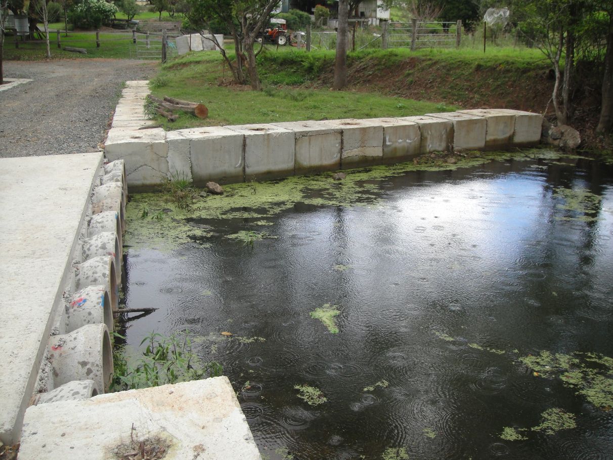 A substantial creek crossing of concrete and concrete reinforced pipes together with a road formed up from the road to the house site where the house and shed areas have been prepared ready to build.