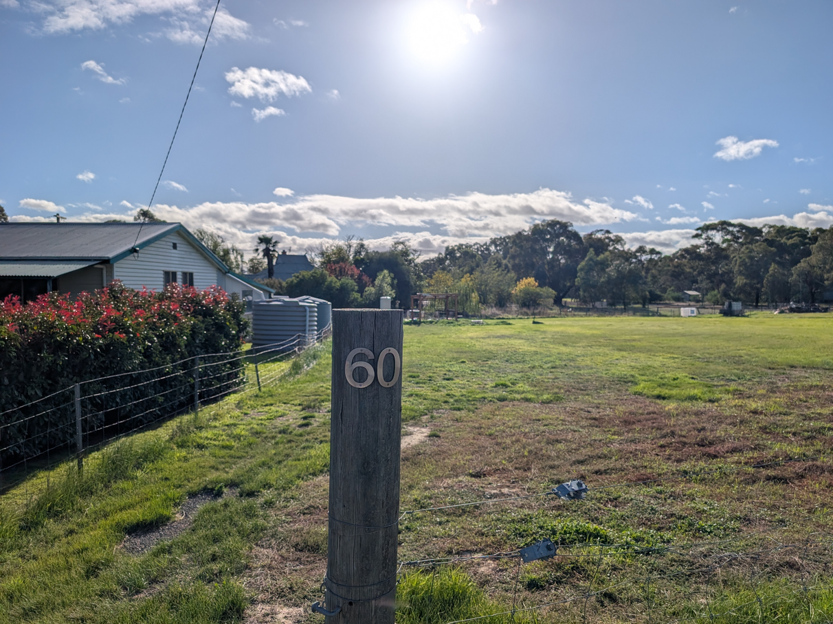 Flat and cleared – just grass. Dual road access from Navarre Street at the front and Government Road at the rear. Views to the forested hills of Kara Kara to the north and west. Kangaroos, cockatoos, parrots – the wildlife comes with the land.