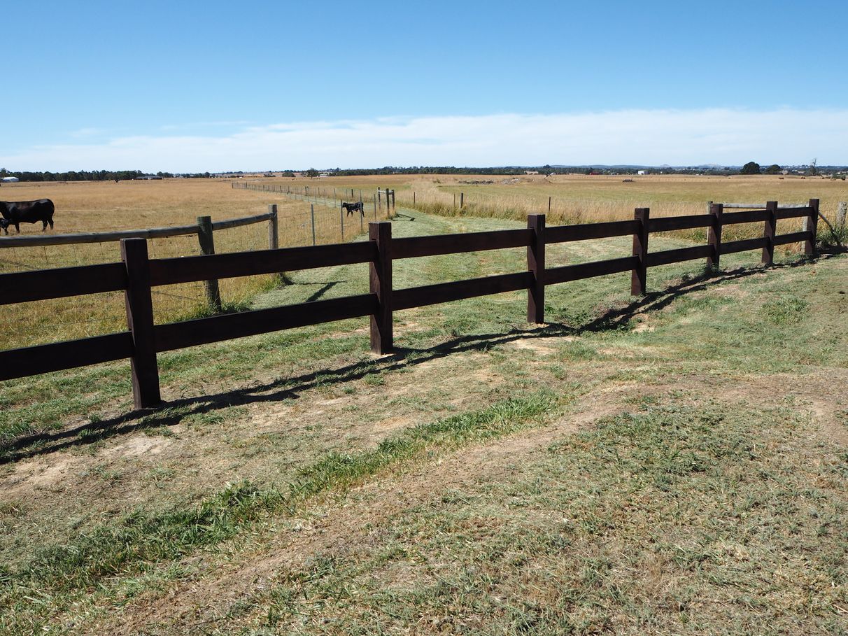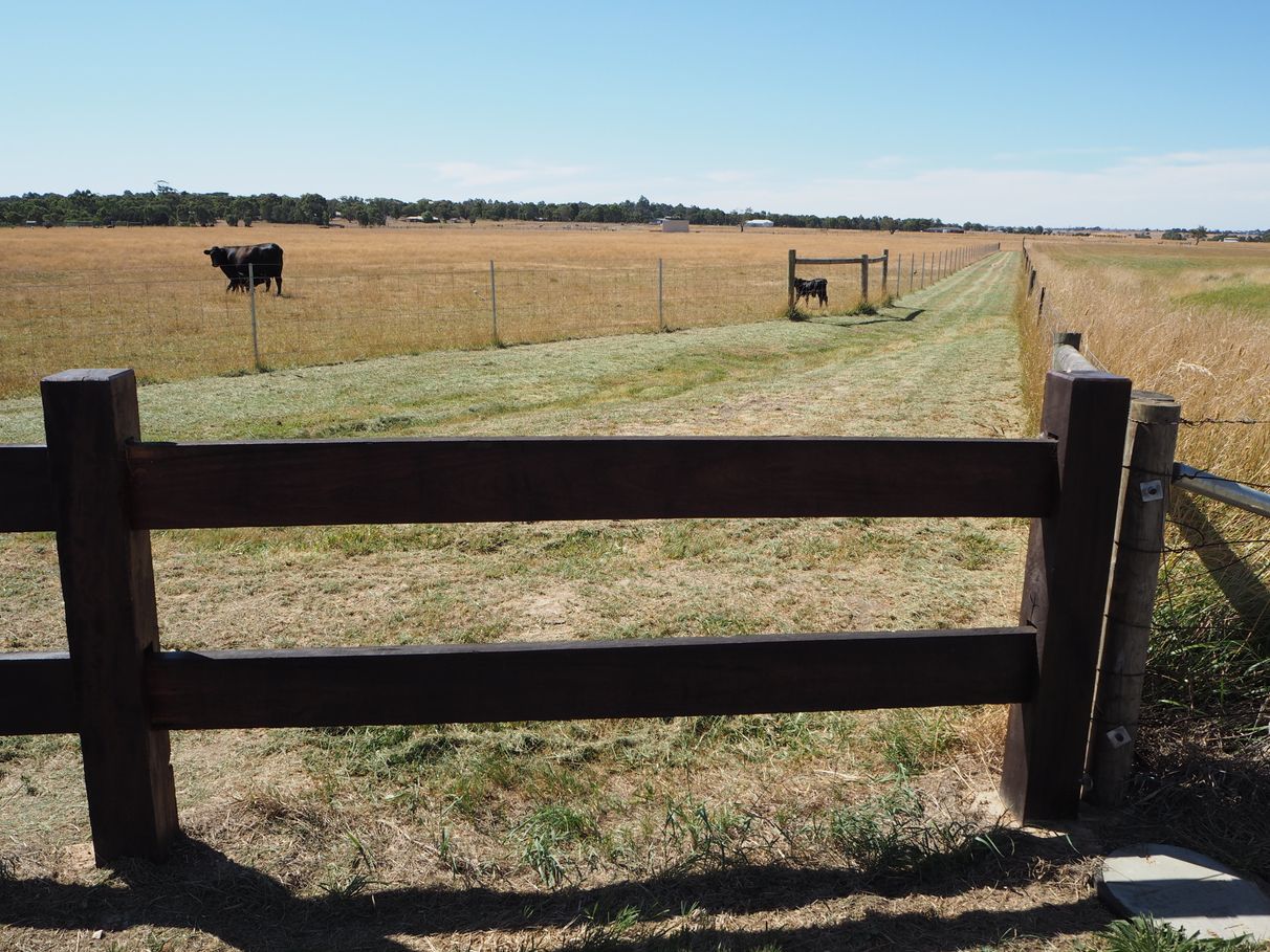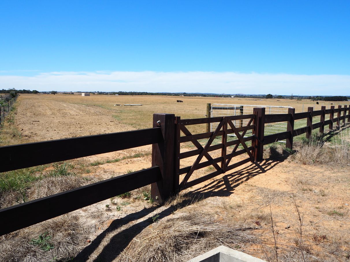 An eye-catching solid red gum post-and-rail fence extends the full length of road frontage, with matching entrance gate, all freshly weatherproofed with timber oil.