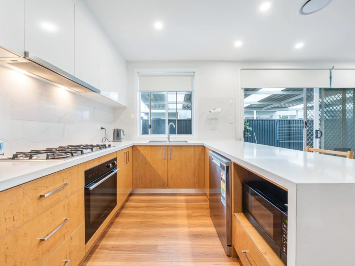 • Modern kitchen with ample storage, gas cooktop, and dishwasher