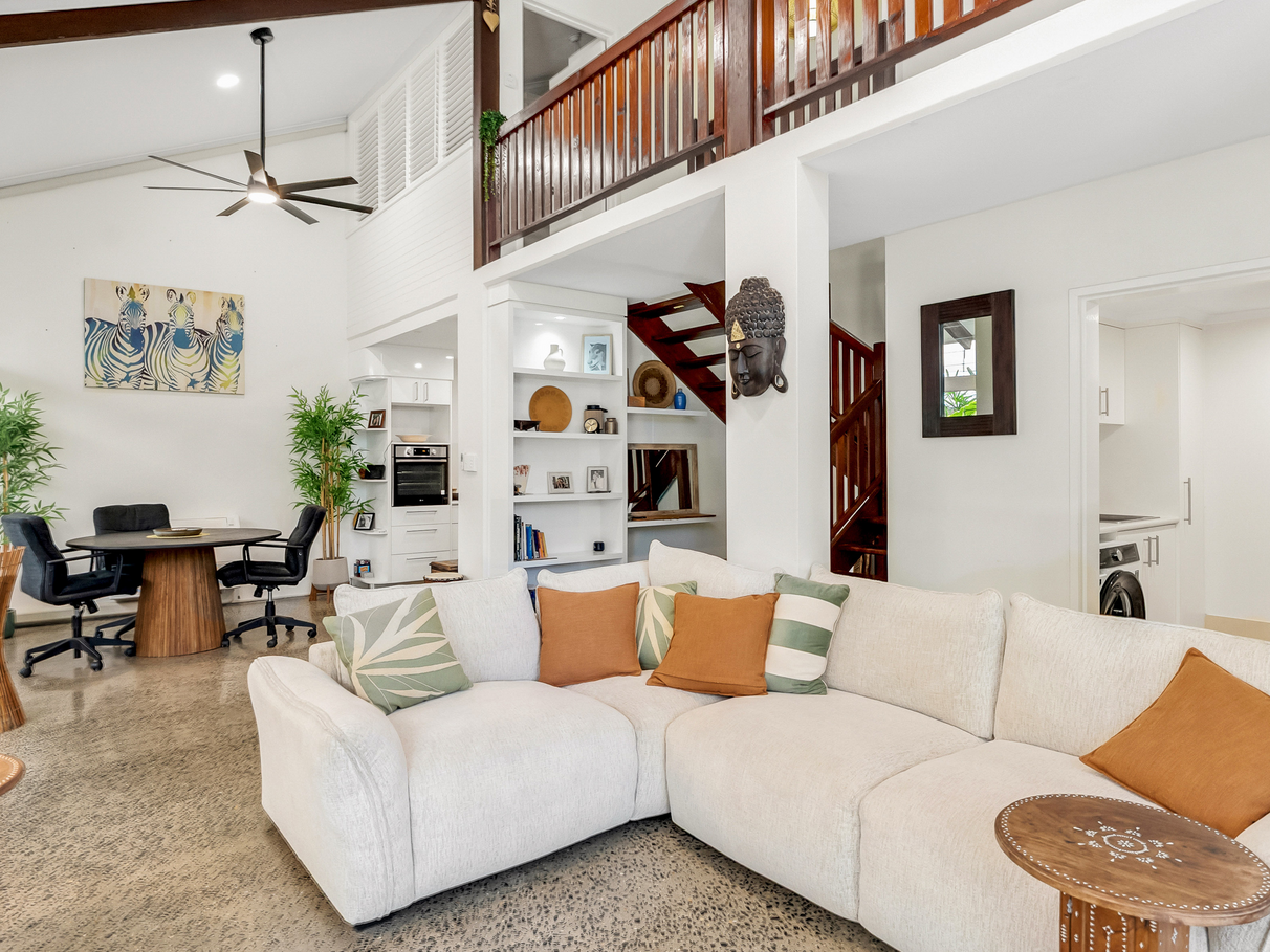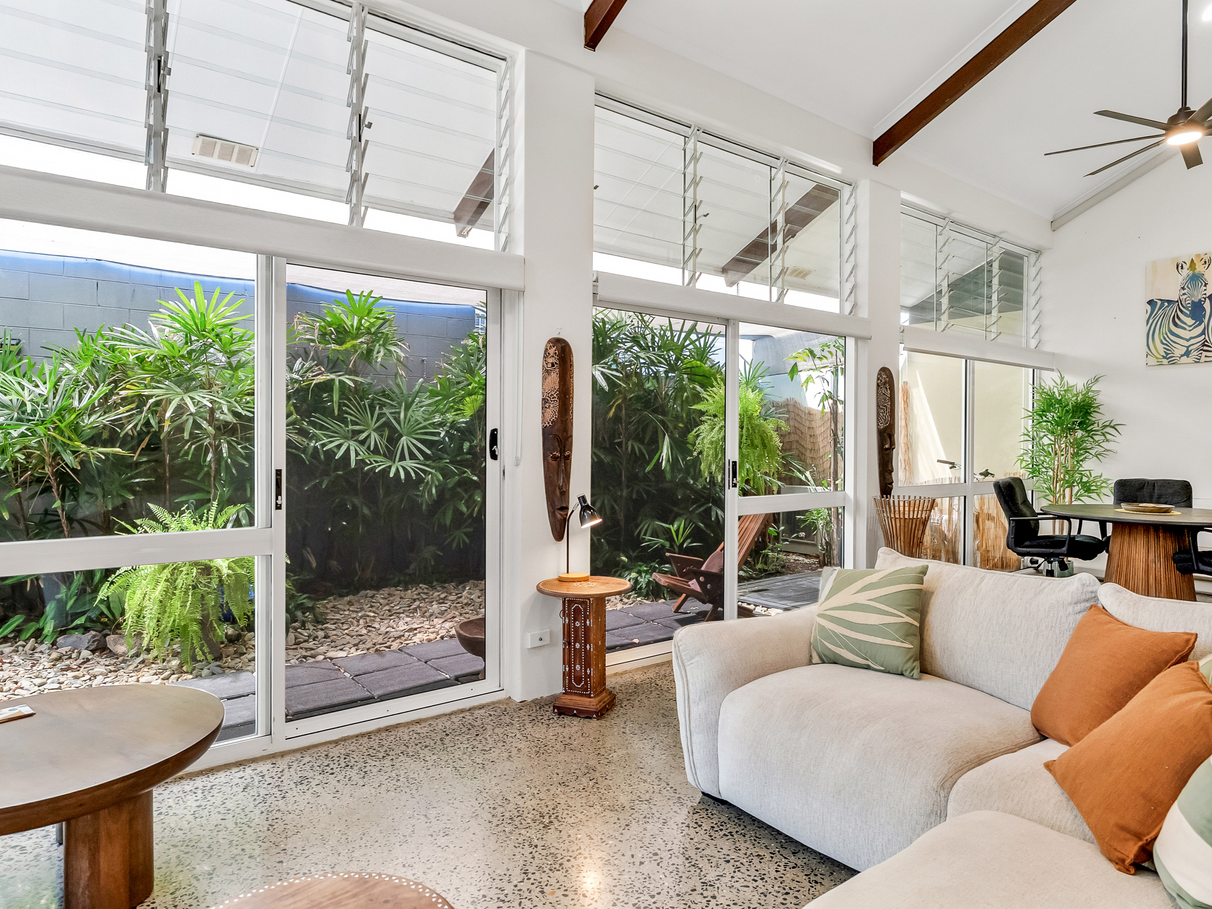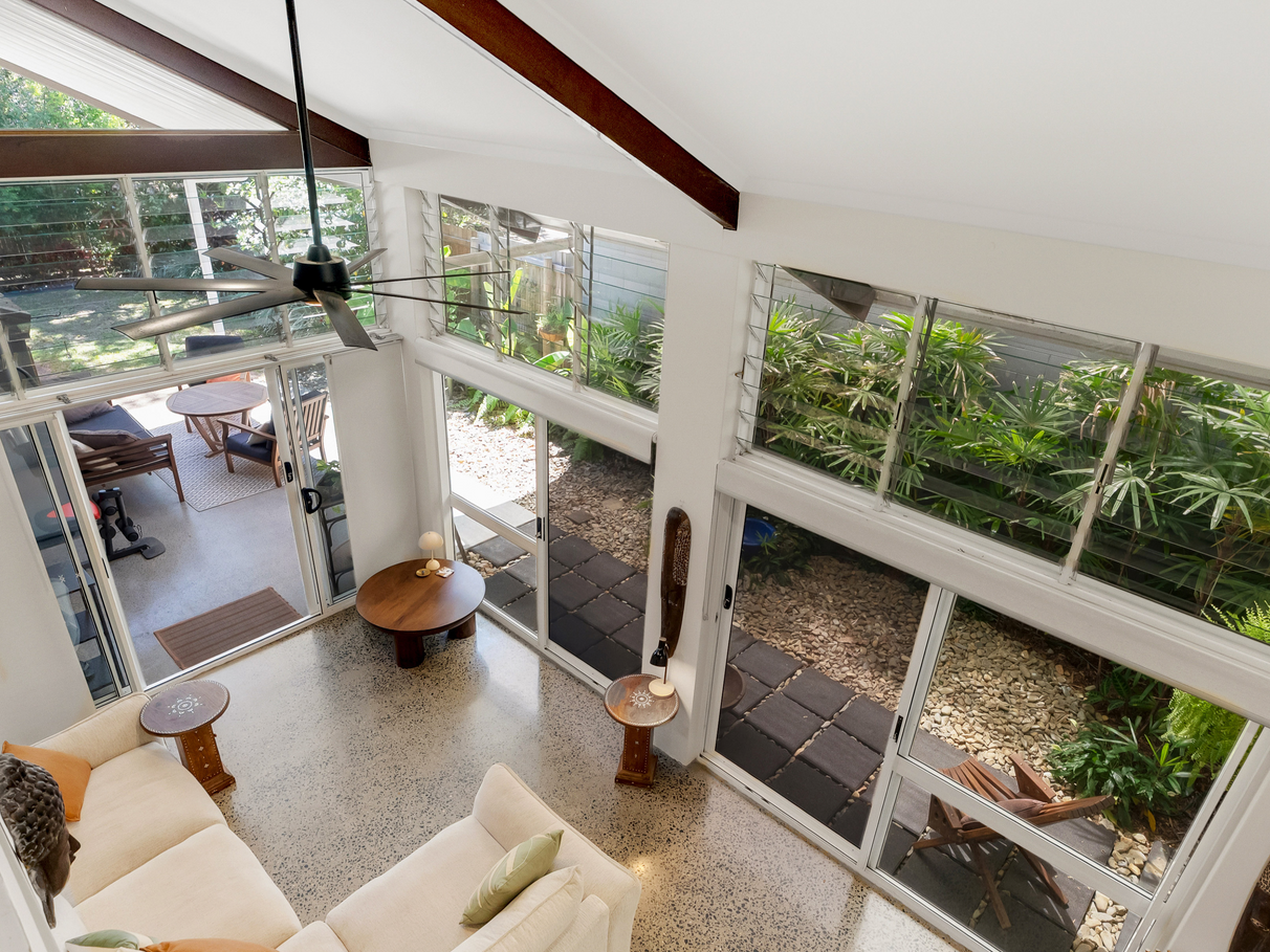 Unique architectural design with high raked ceilings and mezzanine floor. Elevated airy space with natural light and cool polished concrete floors. Two well appointed bedrooms and bathrooms. Main bedroom with private balcony overlooking garden .