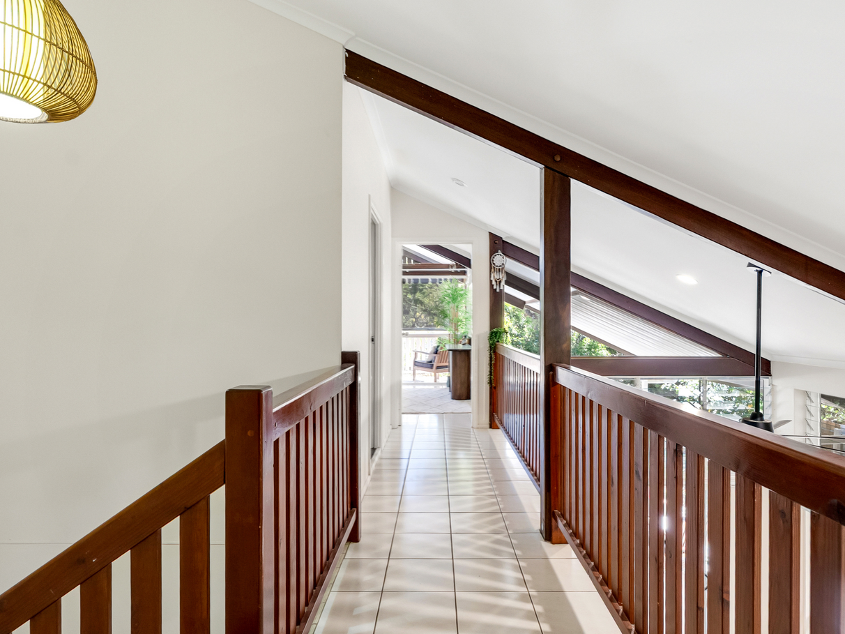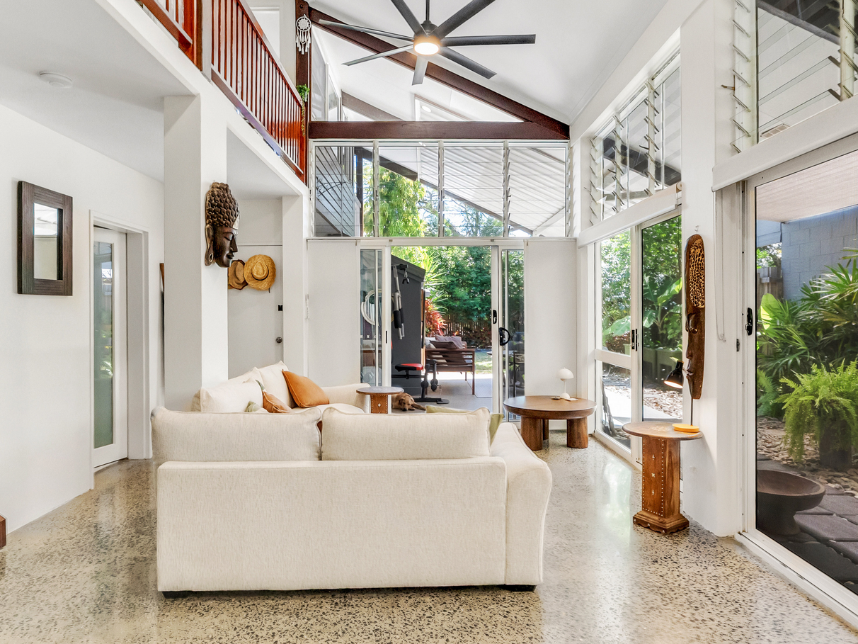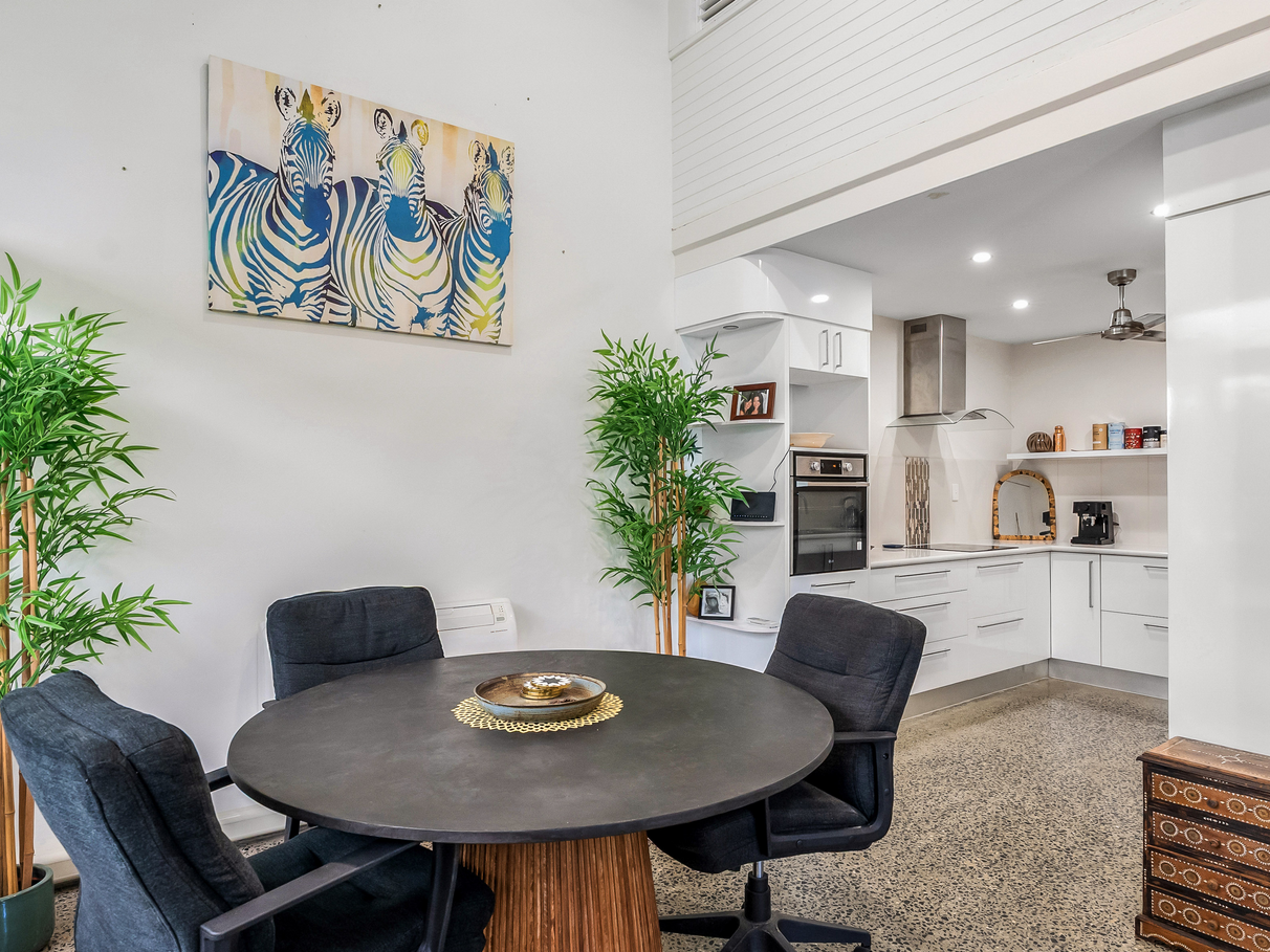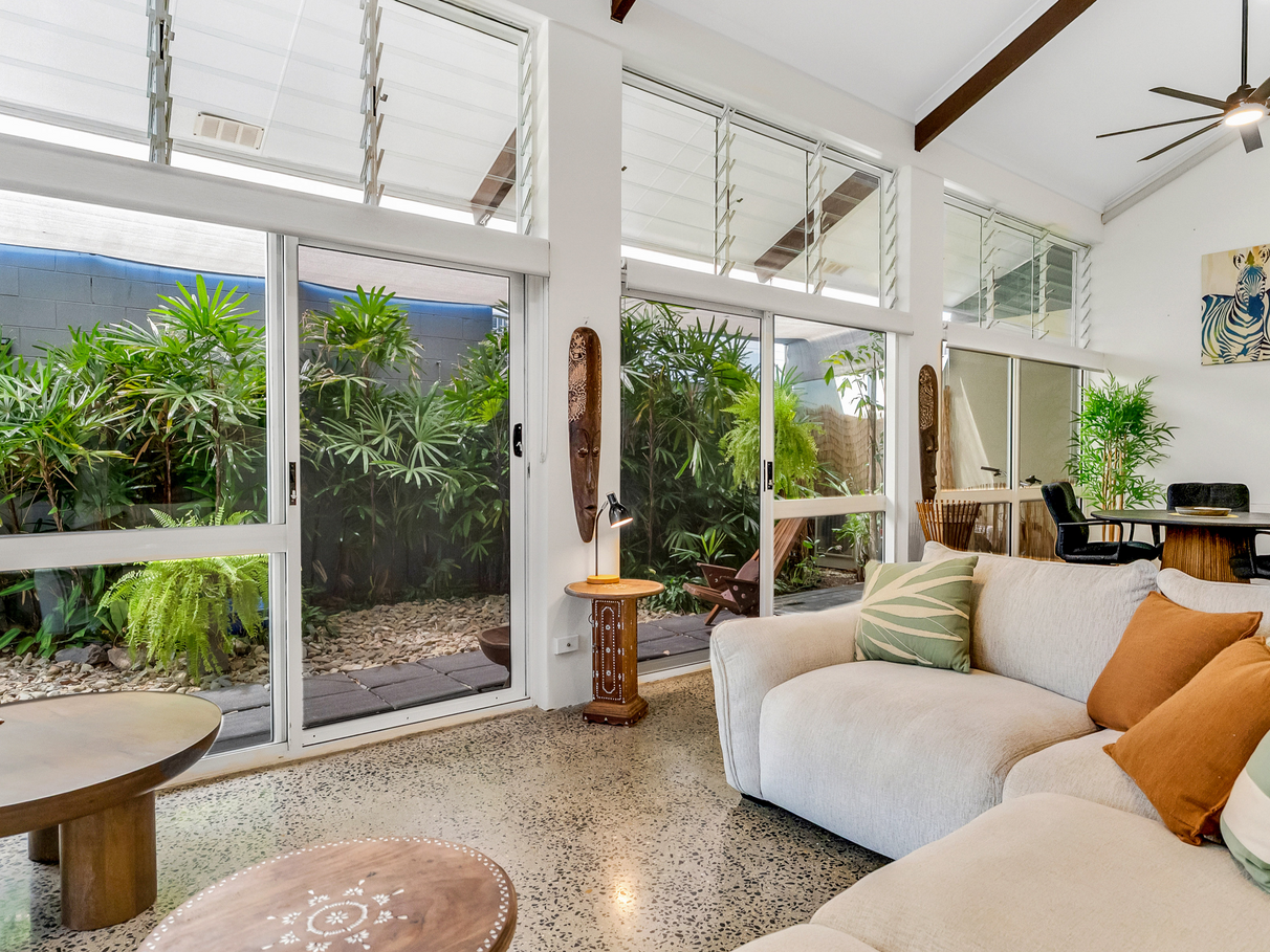 Unique architectural design with high raked ceilings and mezzanine floor. Elevated airy space with natural light and cool polished concrete floors. Two well appointed bedrooms and bathrooms. Main bedroom with private balcony overlooking garden .
