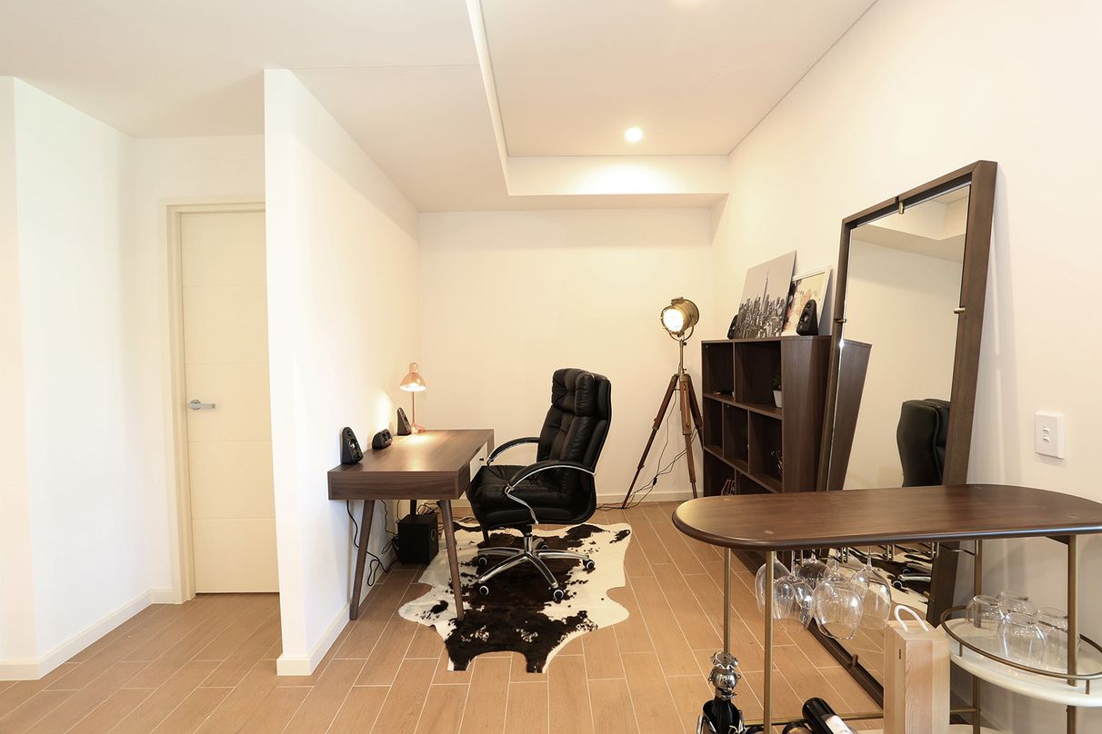 This light-filled apartment offers effortless open plan living, the favourable sized bedroom comes with mirrored built in robes, next to an open study creating more space. The kitchen is equipped with stainless steel smeg appliances, gas cooking, CaesarStone benchtops. It flows into an expansive living dining area, stepping onto a bright balcony. With a full laundry tucked away out of sight behind the kitchen, this stylish abode ticks all the boxes for convenient modern living. The fresh light interior and timber-look tiles throughout the central areas complete the contemporary look.