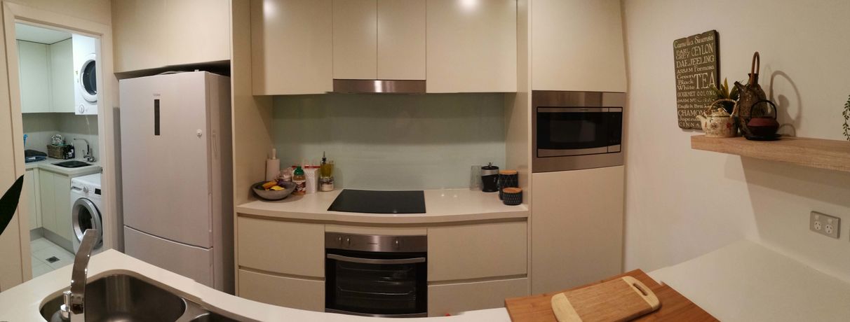 Quality kitchen with 40mm stone waterfall benchtops, glass splash-back and heaps of storage and benchtop space