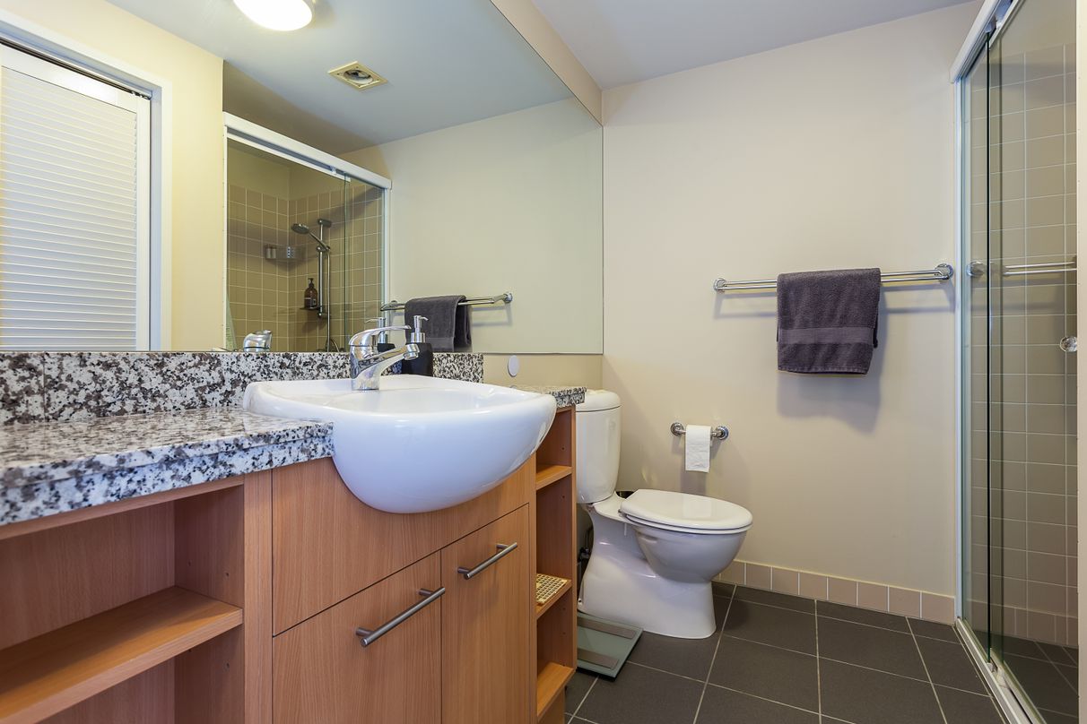 The main bathroom features a large shower, vanity, toilet and ample laundry space.