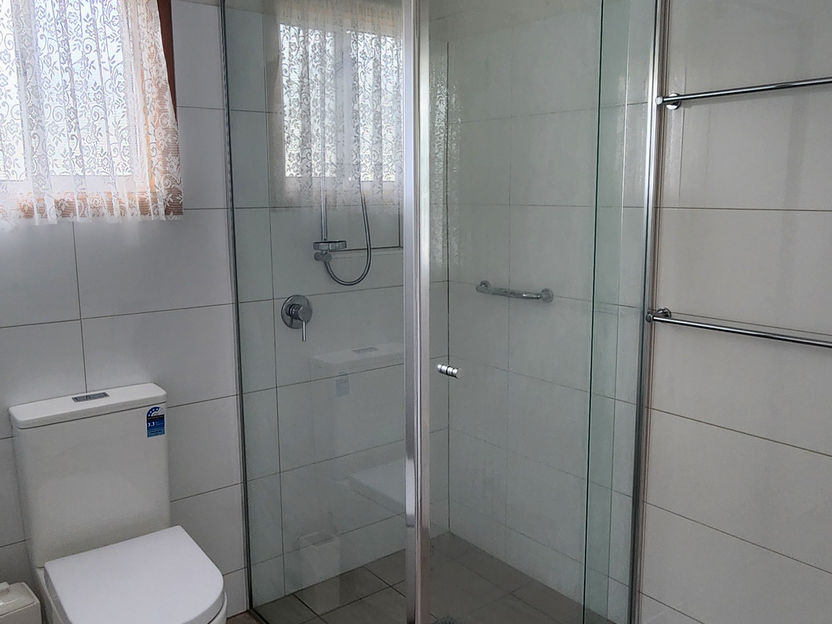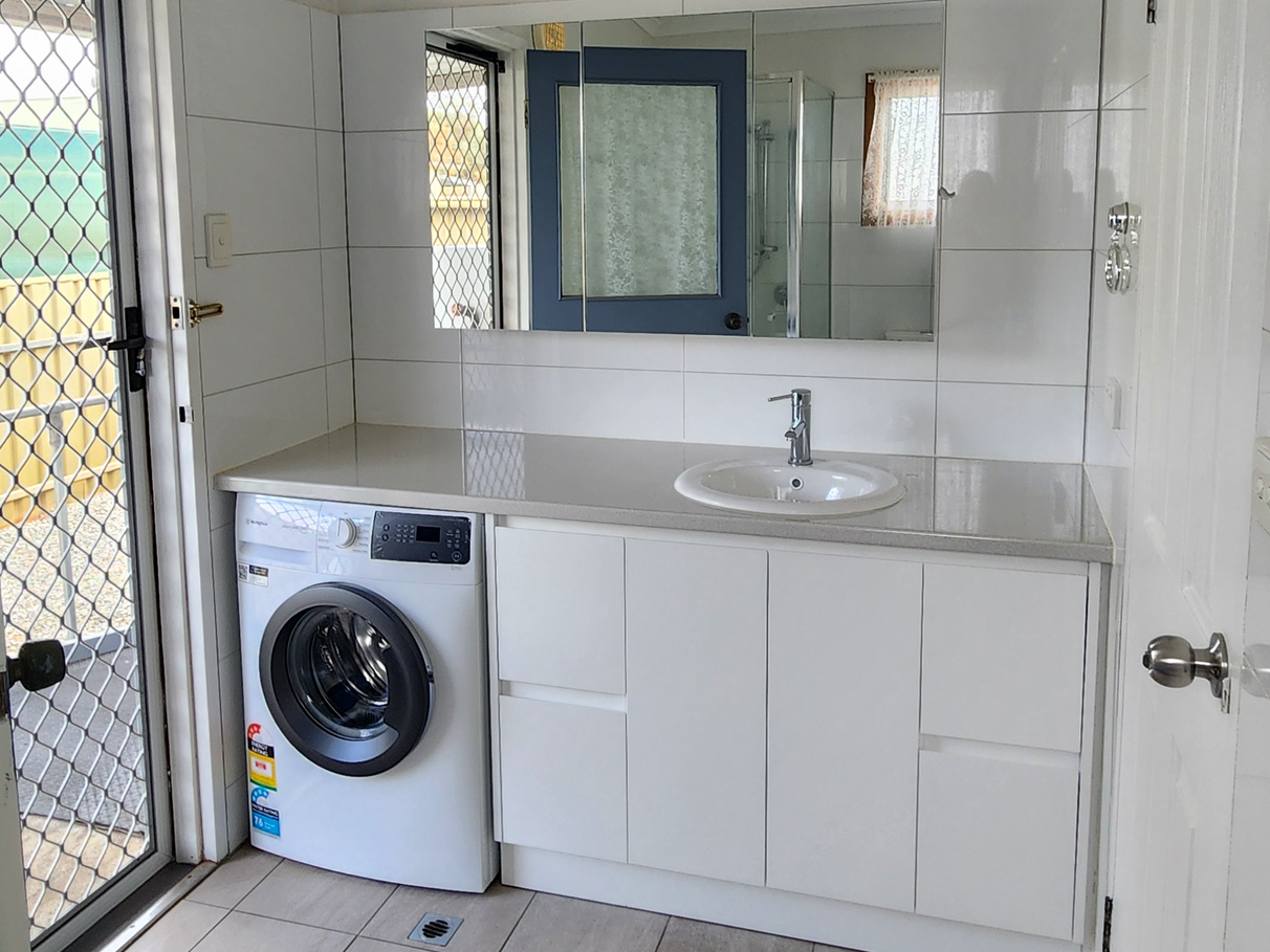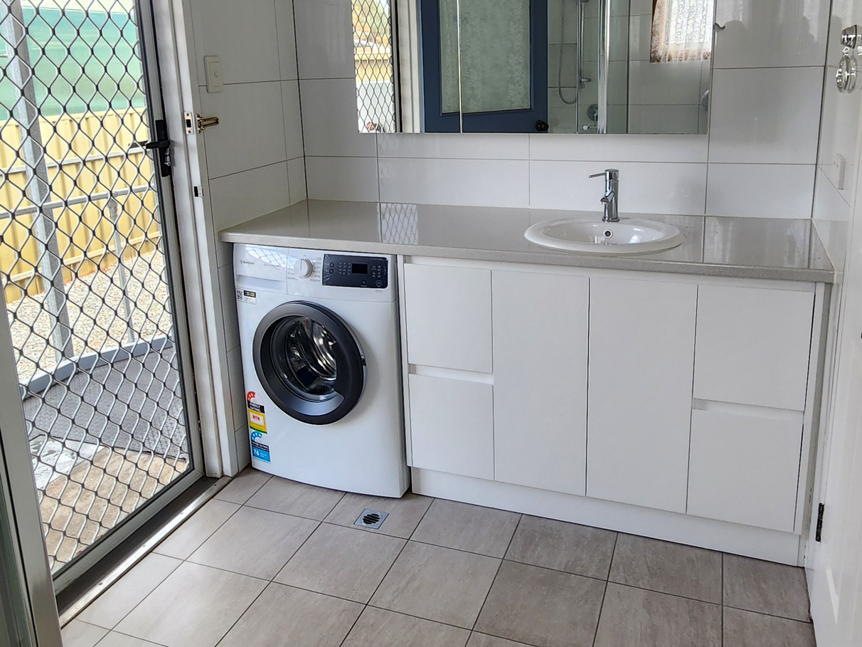 The modern and newly renovated bathroom/laundry has a shower, vanity, washing machine, mirror and toilet all with external access to the backyard.