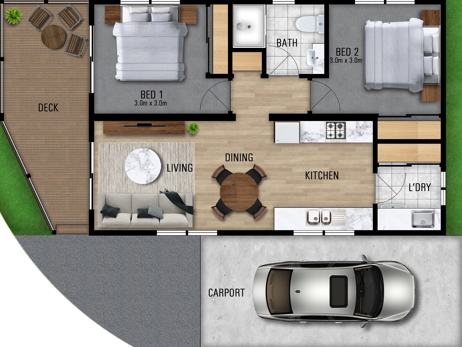 The low-maintenance yard is finished off with a front garden that once established will be easily maintained and colourful when in bloom.