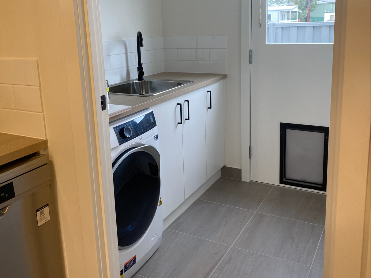 Walking through the kitchen into the laundry, there is a generous sized work area with cupboards both under the bench and the full length of the opposite wall. The back door leads out into the low-maintenance rear yard.