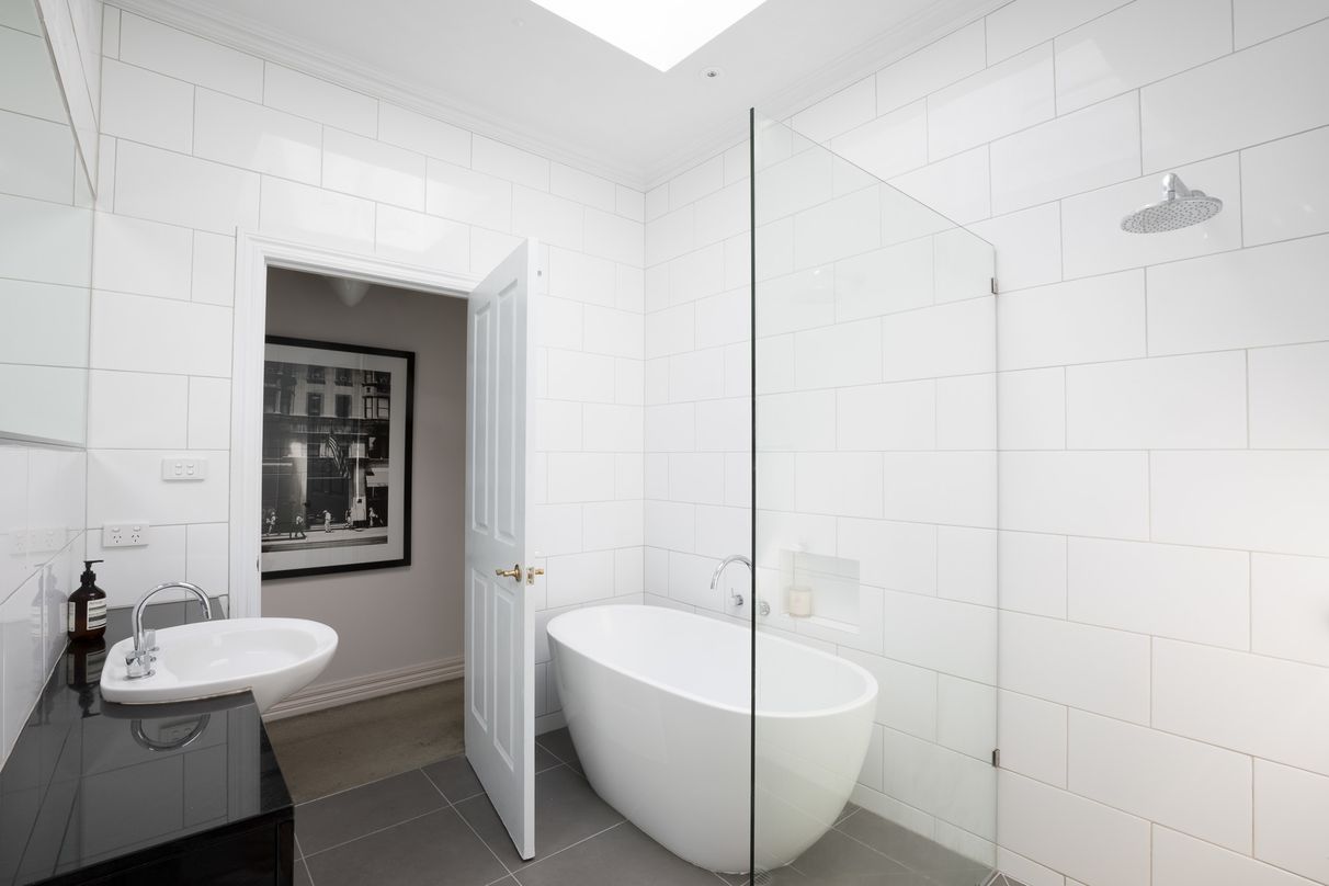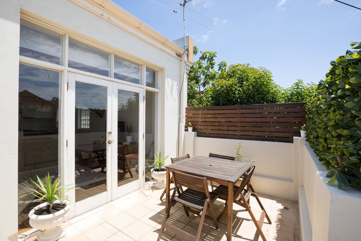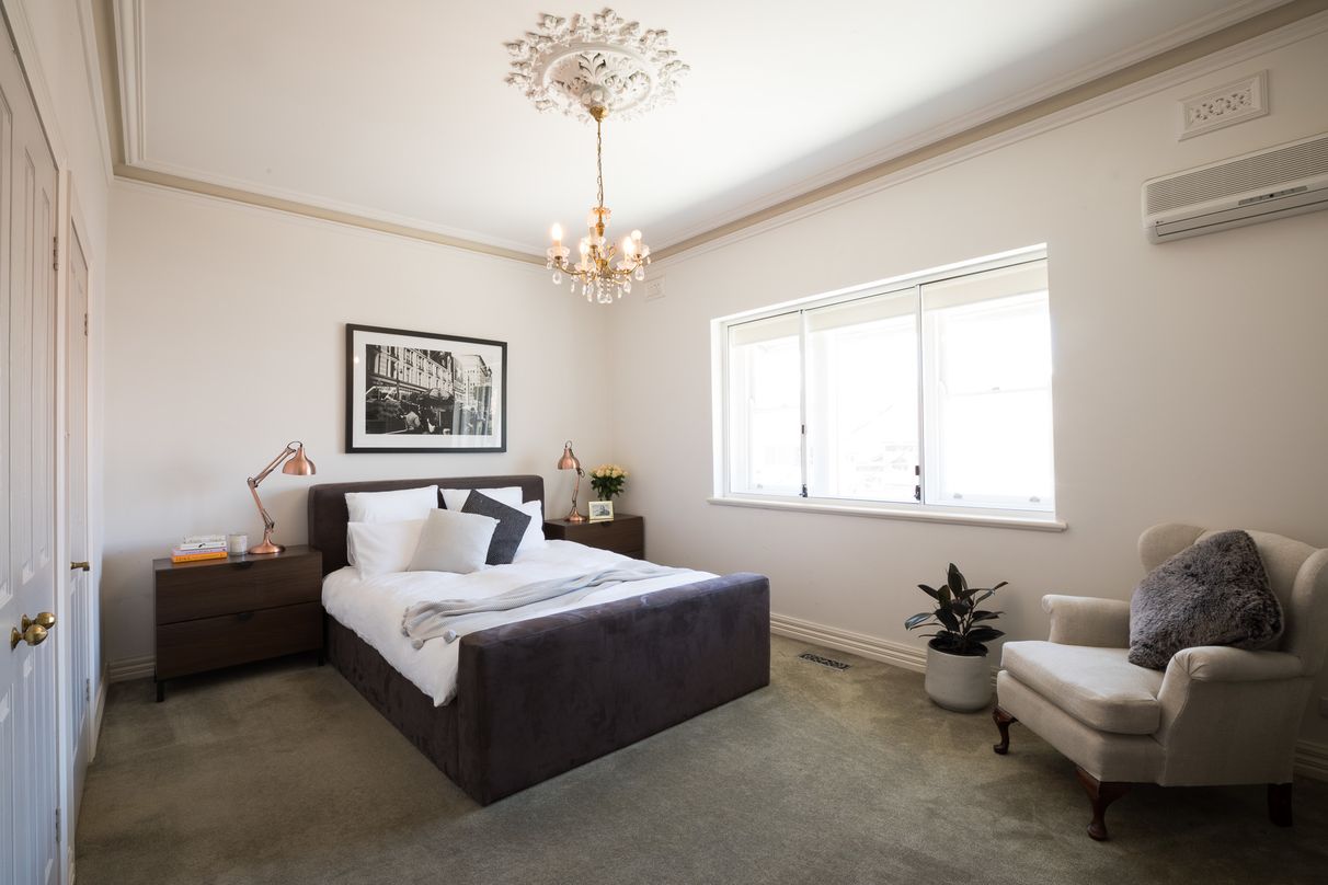 The stylish master bedroom has an art deco fireplace, ceiling rose and chandelier. Polished floorboards exist in the main open plan living and dining area, which opens onto a large north-facing terrace. With no neighbours in sight, the rear outdoor area offers complete privacy, perfect for barbeques and entertaining.