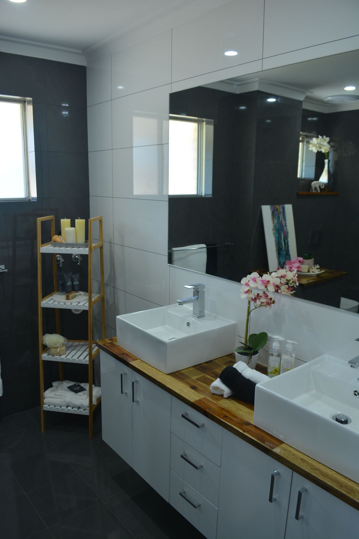 - Large fully tiled bathroom with his/her vanity