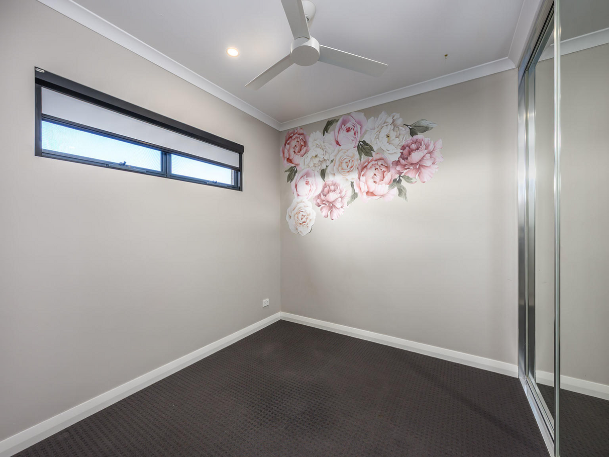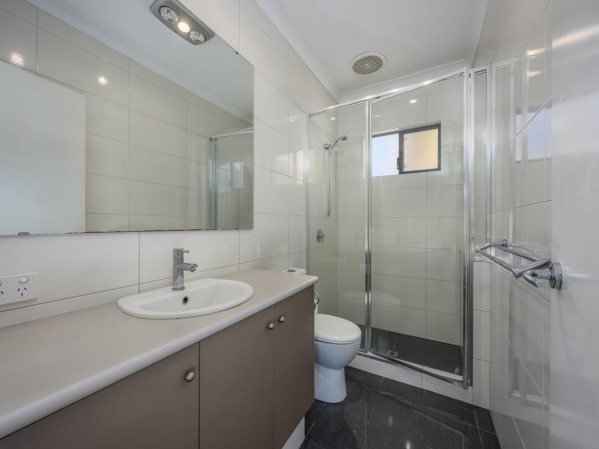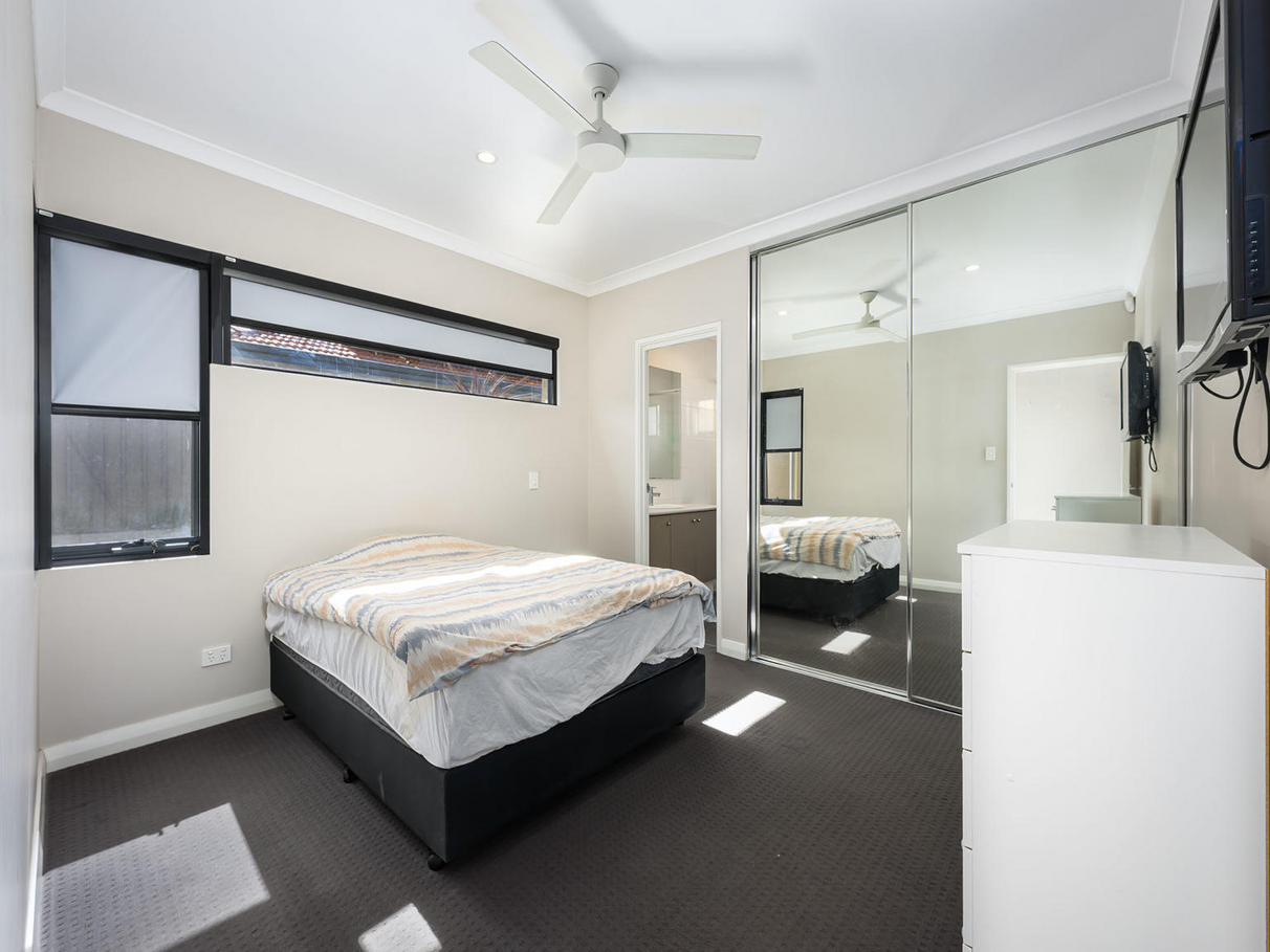 main bedroom with built in robes, ceiling fan and en suite bathroom .
