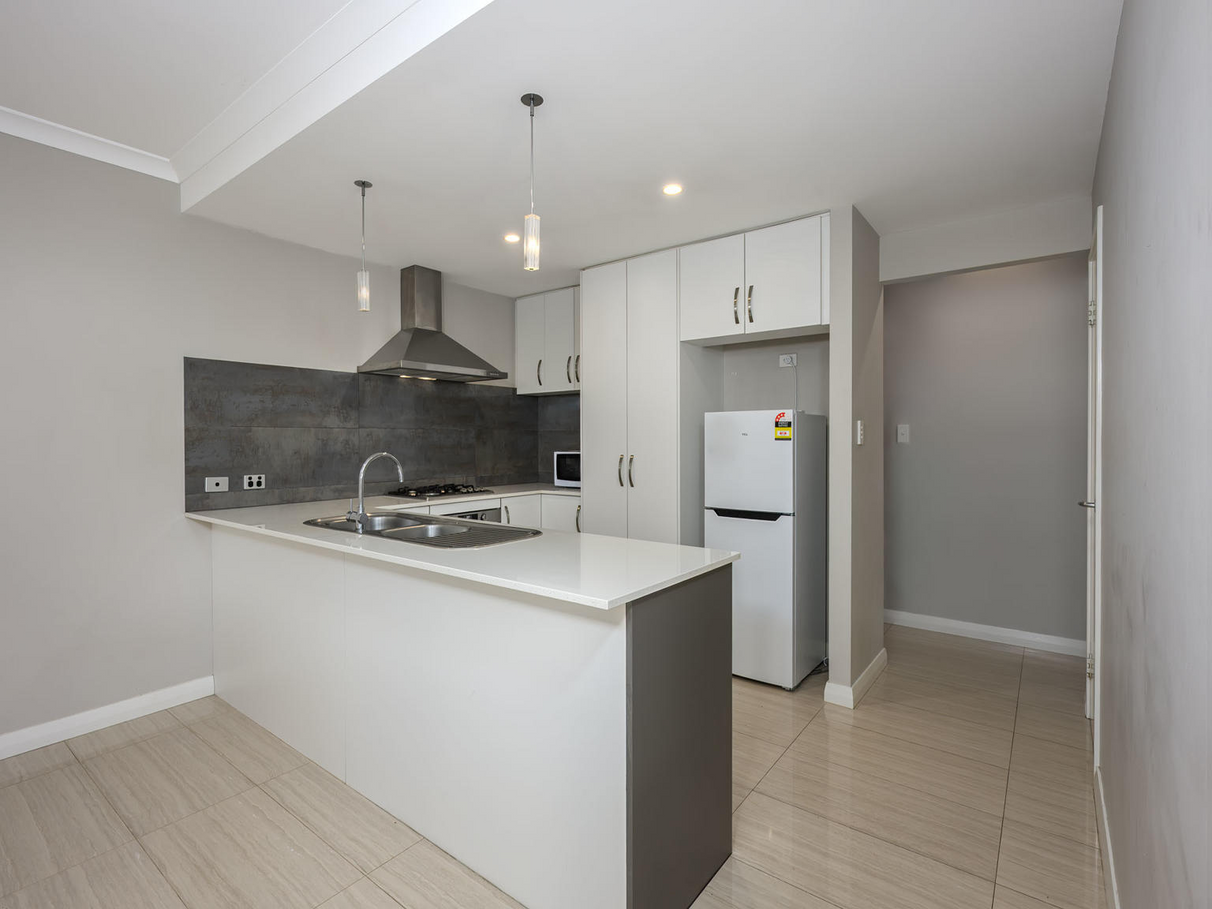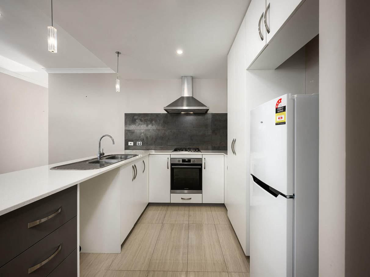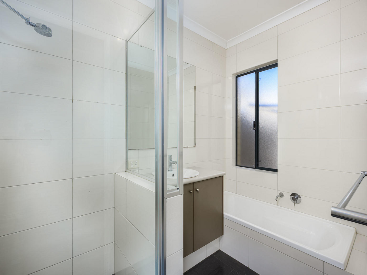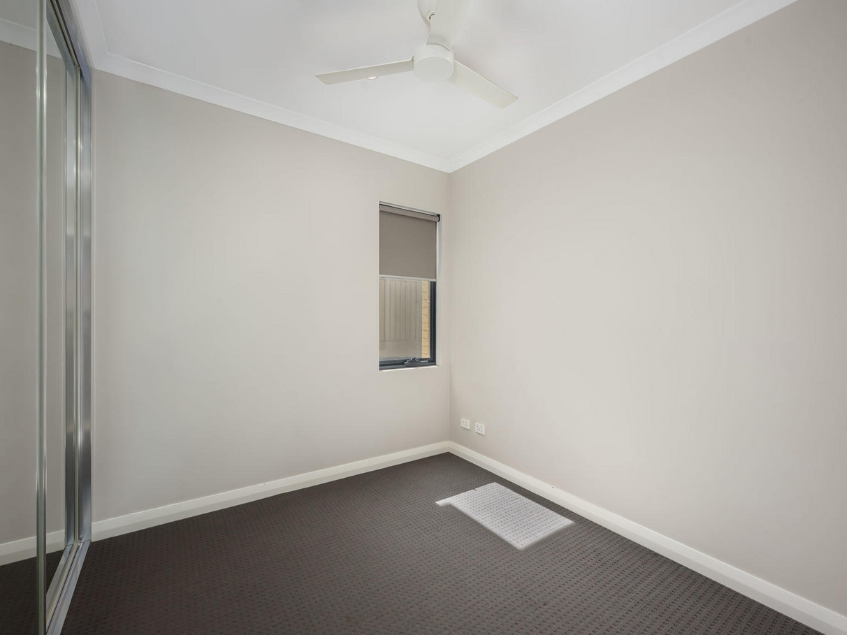 main bedroom with built in robes, ceiling fan and en suite bathroom .